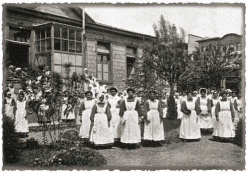 | Sağlık alanında kadınların yer almasına karşı olan görüşlerin tersine, Besim Ömer Paşa (1862-1940) liderliğinde başlayan hemşirelik ve ebelik eğitiminin öncü mezunları. | ||