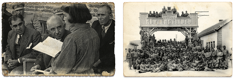 | Köy Enstitülerine hayat verenler: (Soldan) Milli Eğitim Bakanı Hasan Ali Yücel, Cumhurbaşkanı İsmet İnönü, İlköğretim Genel Müdürü İsmail Hakkı Tonguç. | Hasan Ali Yücel’in söylemiyle “Atatürk’ün parçaları olmak üzere”, her bir köye öğretmen olarak gönderildi. |