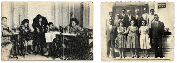 | Trabzon Beşikdüzü köy enstitüsü, kızlı-erkekli dikiş dersleri. | 1960 yılı Balıkesir imam hatip lisesi öğretmenleri. |